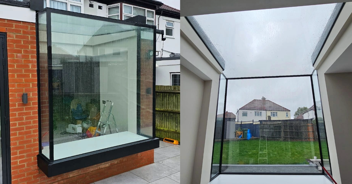 He emphasised that the project hinged on accuracy rather than scale. “This job was all about precision,” he said. Frameless structural glass had to be set exactly on both the vertical and roof sections to achieve a clean, seamless junction between planes. Aluminium pressings were then installed around the roof line “giving everything a sharp, modern finish”.